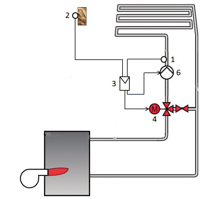 Obr. 2 Regulácia teploty vykurovacej vody podľa vonkajšej teploty – zdroj tepla pracuje s konštantnou teplotou výstupu do 60 °C [3], 1 – snímač teploty vykurovacej vody, 2 – snímač vonkajšej teploty, 3 – regulátor, 4 – trojcestný regulačný ventil s pohonom