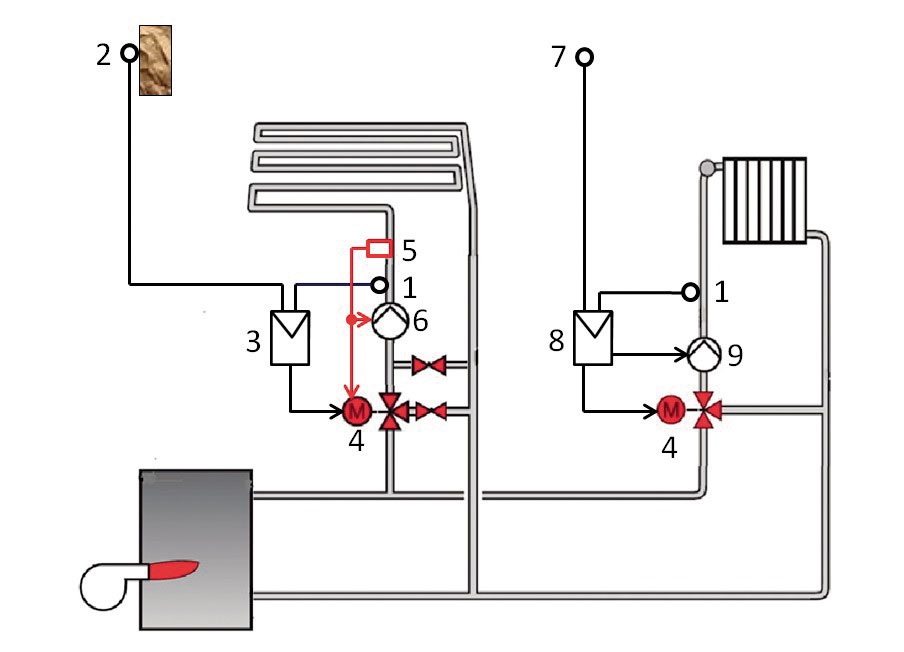 Obr. 3 Kombinovaná vykurovacia sústava s podlahovým teplovodným a konvekčným vykurovaním v rámci jednej miestnosti, 1 – snímač teploty vykurovacej vody, 2 – snímač vonkajšej teploty, 3 – regulátor okruhu podlahového vykurovania, 4 – trojcestný zmiešavací ventil s pohonom, 5 – dvojpolohový regulátor s ponorným snímačom teploty, 6 – čerpadlo okruhu podlahového vykurovania, 7 – snímač priestorovej teploty, 8 – regulátor okruhu konvekčného vykurovania, 9 – čerpadlo okruhu konvekčného vykurovania