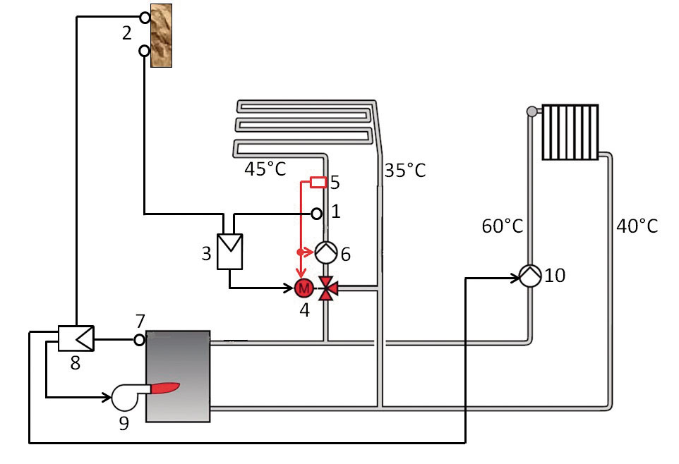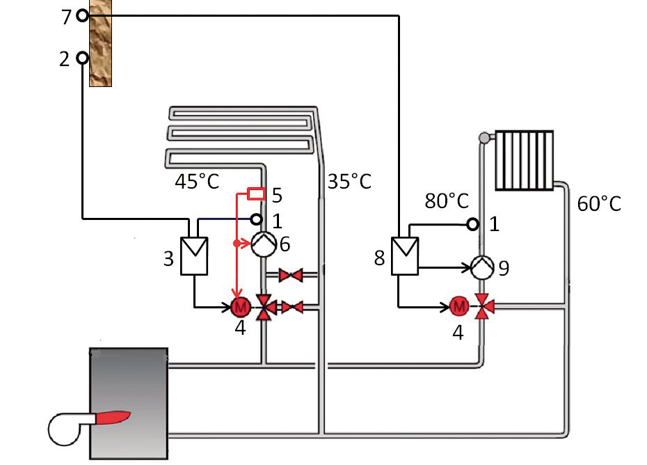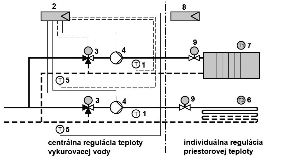 - V rámci miestnosti je úmyselne navrhnutá kombinácia sálavého a konvekčného vykurovania s cieľom zlepšiť dynamické správanie celého systému. Zotrvačnosť podlahového vykurovania spôsobuje problémy hlavne v prechodných obdobiach, keď sú zvyčajne prudšie výkyvy vonkajšej teploty počas dňa a noci. Navyše, cez deň je v tomto období ešte dostatok slnečného svitu, čo spôsobuje zvyšovanie vnútornej teploty, s čím má zotrvačný systém problém sa rýchlo vyrovnať. Podlahové vykurovanie sa navrhuje tak, aby krylo približne 50 až 70 % celkových tepelných strát objektu. Zvyšok vykrýva pružný a rýchly konvekčný vykurovací systém, najčastejšie sú to konvektory s nízkym objemom vody v telesách. Teplota vykurovacej vody oboch systémov sa riadi podľa ekvitermnej krivky. Možno pri tom aplikovať schému na obr. 4.