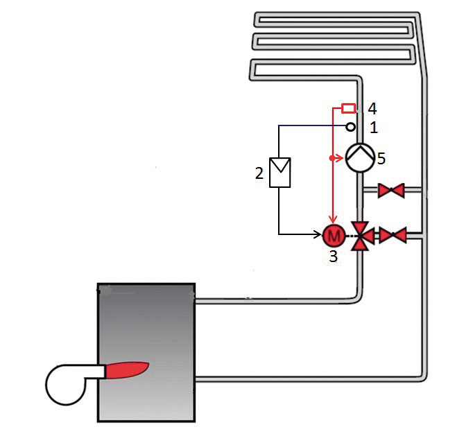Obr. 6 Temperovanie podlahovej plochy [3], 1 – snímač teploty vykurovacej vody, 2 – regulátor podlahového vykurovania, 3 – trojcestný regulačný ventil s pohonom, 4 – dvojpolohový regulátor s ponorným snímačom, 5 – čerpadlo