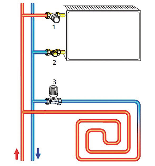 Obr. 8 Temperovanie podlahovej plochy prostredníctvom obmedzovača teploty vratnej vody – teplota prívodu do 50 °C [4], 1 – ventil s termostatickou hlavicou, 2 – spätné skrutkovanie, 3 – obmedzovač teploty vratnej vody