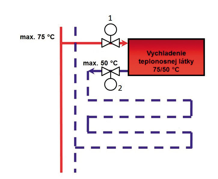 Obr. 9 Temperovanie podlahovej plochy prostredníctvom obmedzovača teploty vratnej vody – teplota prívodu vyššia ako 50 °C [4], 1 – ventil s termostatickou hlavicou, 2 – obmedzovač teploty vratnej vykurovacej vody