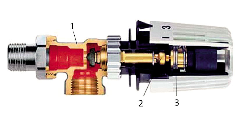 Obr. 7 Obmedzovač teploty vratnej vody [4], 1 – teleso ventilu, 2 – snímač, 3 – ochrana proti nadmernému zdvihu