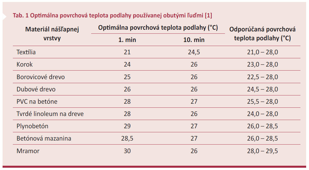 Podľa vyhlášky č. 259/2008 Z. z. Ministerstva zdravotníctva SR sa vyžaduje, aby teplota povrchu podlahy v priestoroch s dlhodobým pobytom ľudí s prevažne sedavou činnosťou (triedy 0 až 1b) bola v rozsahu od 19 do 29 °C (maximálna povrchová teplota pobytovej zóny je 29 °C, kúpeľne 33 °C, okrajové zóny majú 35 °C). Podlahy používané obutými ľuďmi neovplyvňujú z hľadiska aplikovaného stavebného materiálu tepelný stav človeka. V tomto prípade sa odporúča optimálna povrchová teplota podlahy 25 °C pri sediacich osobách a 23 °C pri chodiacich osobách. Odporúčané hodnoty sú uvedené v tab. 1. Priemerná povrchová teplota ovplyvňuje zároveň potrebnú priemernú teplotu prívodu vykurovacej vody, ktorá nesmie prekročiť hodnotu 50 až 60 °C (v závislosti od konštrukcie vykurovacej podlahy).
