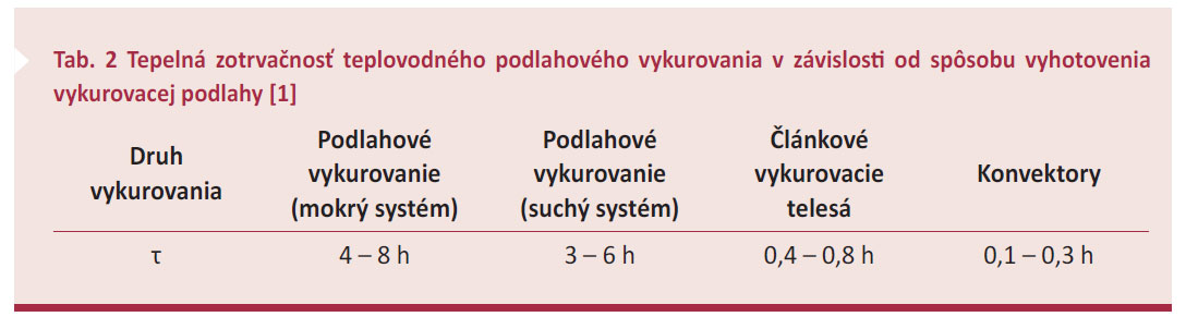 Regulovateľnosť a kvalita regulácie závisia v značnej miere od dynamických vlastností daného systému (počet akumulačných členov a ich vlastnosti). Podlahové vykurovanie sa vyznačuje pomerne veľkou tepelnou zotrvačnosťou, ktorá je daná konštrukciou samotnej vykurovacej podlahy (hrúbka betónovej vrstvy, tepelný odpor nášľapnej vrstvy, hmotnosť vody vo vykurovacích rúrach). Každý zásah riadiaceho systému sa tak prejaví na zmene tepelného výkonu odovzdávaného podlahou až s oneskorením – v dôsledku veľkého podielu akumulácie, vyjadrenej časovou konštantou τ (pomer naakumulovaného tepla v podlahe a tepelného výkonu podlahy) (tab. 2). Z tohto dôvodu nie je efektívne využiť centrálnu reguláciu teploty vykurovacej vody podľa priestorovej teploty.