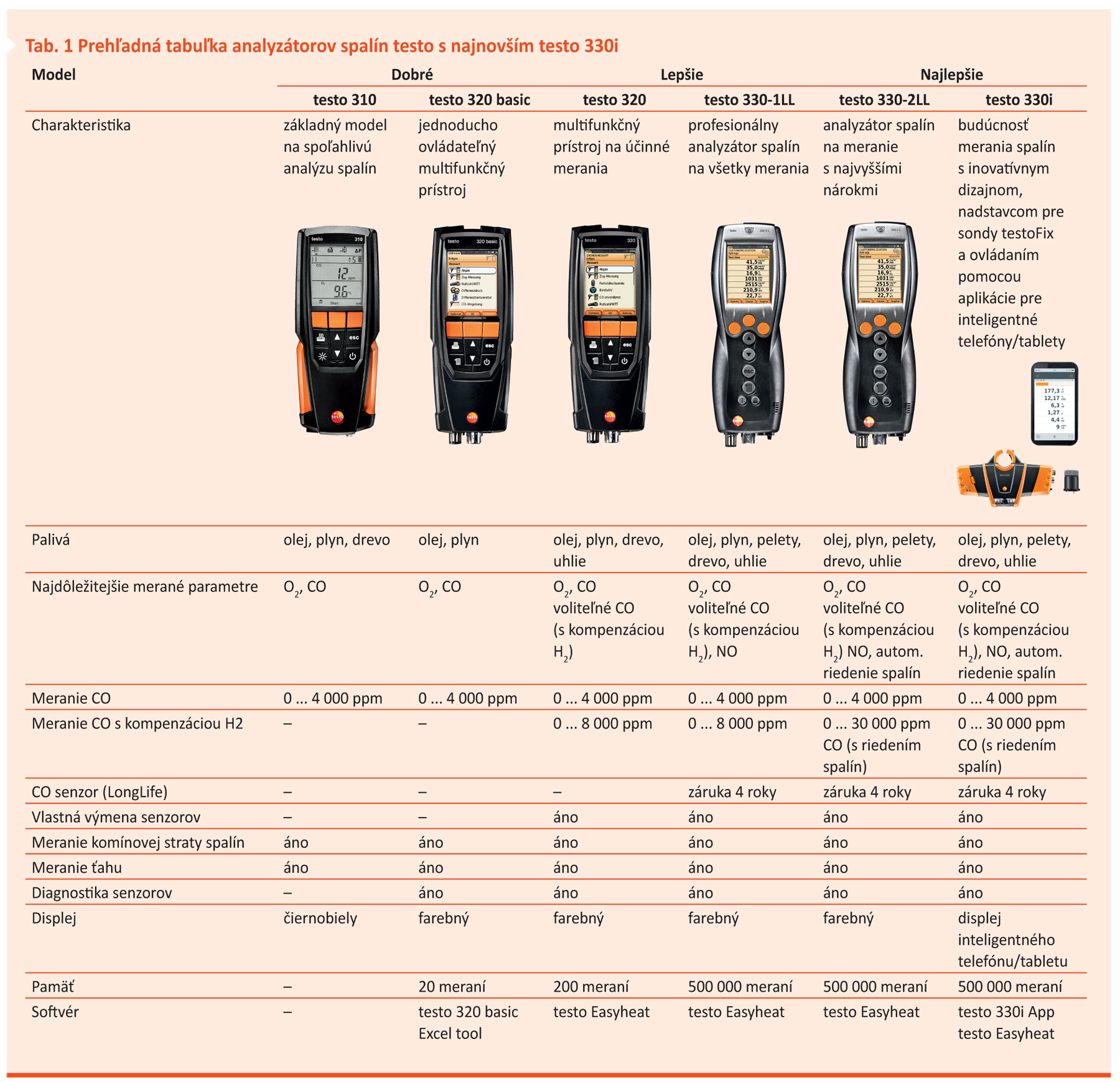 Užívateľ požaduje najčastejšie merať koncentráciu O2, CO2, CO, NO, teplotu spalín, nadbytok vzduchu, účinnosť spaľovania, komínovú stratu a komínový ťah. Analyzátory firmy TESTO AG z nemeckého Schwarzwaldu pracujú s elektrochemickými senzormi a spĺňajú náročné požiadavky užívateľov na analýzu spalín a optimálne nastavenie spaľovania. S novým analyzátorom spalín testo 330i si výrobca upevňuje svoju pozíciu svetového lídra na trhu technológii merania v oblasti vykurovania.