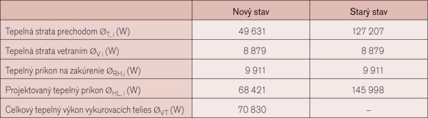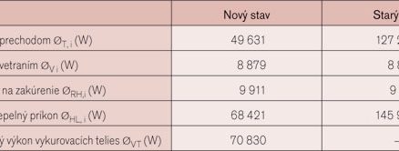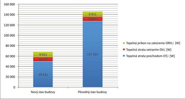 Základom pre návrh vykurovacej sústavy, ako aj vyhodnotenie energetickej bilancie objektu, je výpočet projektovaného tepelného výkonu v zmysle normy STN EN 12831. Podľa výpočtu je projektovaný tepelný príkon pre riešenú časť budovy ΦHL = 68 421 W. Celkový tepelný príkon pre budovu v novom stave po návrhu vykurovacích telies bude ΦVT = 70 830 W. Pri výpočte sa uvažovali navrhované tepelnotechnické vlastnosti konštrukcií. Rovnakým postupom prebiehal aj výpočet projektovaného tepelného príkonu pre budovu v pôvodnom stave Φ`HL . Pri výpočte tepelných strát prechodom sa brali do úvahy súčasné tepelnotechnické vlastnosti stavebných konštrukcii. Porovnanie vlastností konštrukcii riešenej časti budovy je v tab. 2. Projektovaný tepelný príkon pre budovu v starom stave bude Φ`HL = 145 998 W. Porovnanie tepelných príkonov pre budovu v novom a starom stave je v tab. 2 a na grafe na obr. 1.