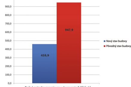 Podobne ako pri porovnaní potreby tepla sa aj pri výpočte potreby energie preukázalo, že vplyvom rekonštrukcie budovy klesne potreba energie na vykurovanie o 53 %, čo predstavuje pri súčasnej cene tepla nemalé úspory nákladov na vykurovanie.