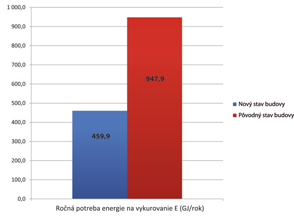 Obr. 2: Porovnanie ročnej potreby energie na vykurovanie budovy v novom stave a v pôvodnom stave