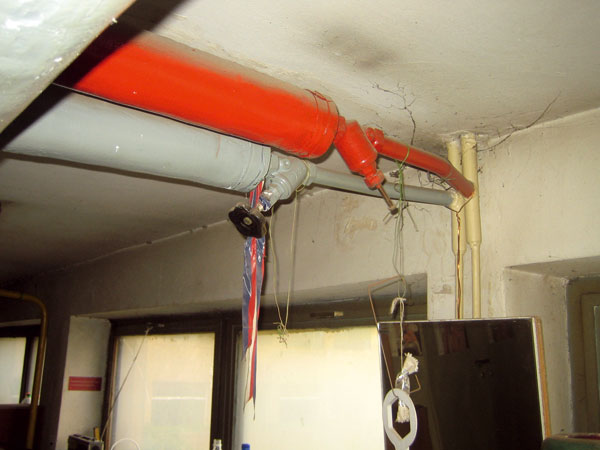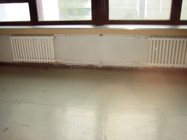 Ležaté potrubie, aj stúpacie a pripojovacie potrubia, sú oceľové závitové. Ležaté potrubie vedie pod stropom OST a ďalej stúpa do rozvodného kanála. Z kanála potom stúpa pod strop 1. PP, kde sa rozdeľuje na dve vetvy – zvlášť pre severovýchodnú a juhozápadnú časť budovy. Ležaté potrubie je izolované a pod stropom vedie zavesené na závesoch. Zvislé stúpacie potrubia napojené na ležaté potrubia vedú medzi oknami. Tepelné spotrebiče (vykurovacie telesá) sú liatinové článkové – typu Slávia.