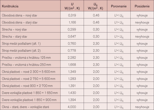 Tab. 1: Hodnoty súčiniteľa prechodu tepla stavebnej konštrukcie U a ich porovnanie s normovým súčiniteľom prechodu tepla vonkajšej steny UN a posúdenie podľa STN 73 0540