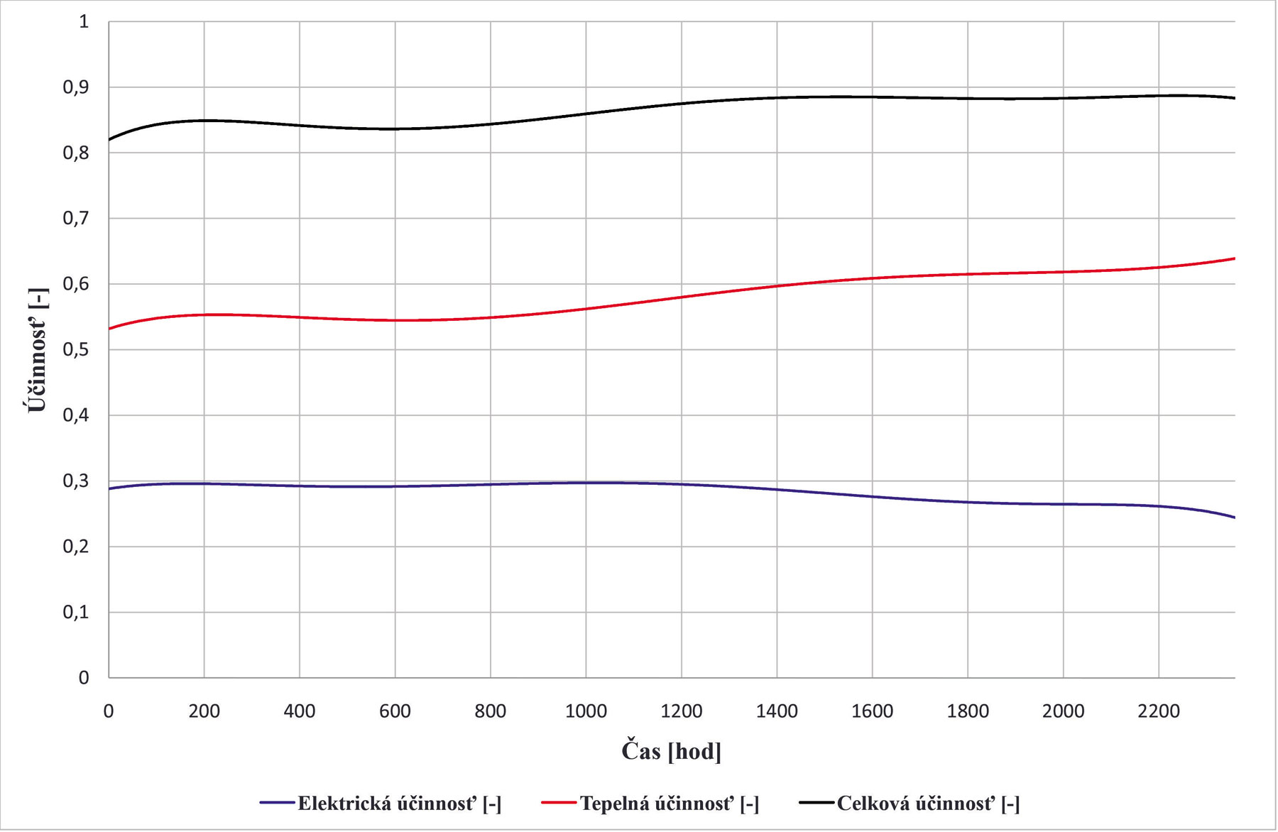 Na obr. 7 je priebeh účinností počas dlhodobého merania. Celková účinnosť jednotky je prakticky počas celého merania konštantná, jej hodnota je 0,88. Elektrická účinnosť počas merania klesla z počiatočnej hodnoty 0,3 na hodnotu 0,25. Tepelná účinnosť mierne vzrástla z hodnoty 0,53 na hodnotu 0,64. Je to spôsobené znížením elektrickej účinnosti, čo vedie k zvýšeniu množstva nezreagovaného zemného plynu v palivovom článku – tento plyn sa potom mení na tepelnú energiu v zóne dohárania.