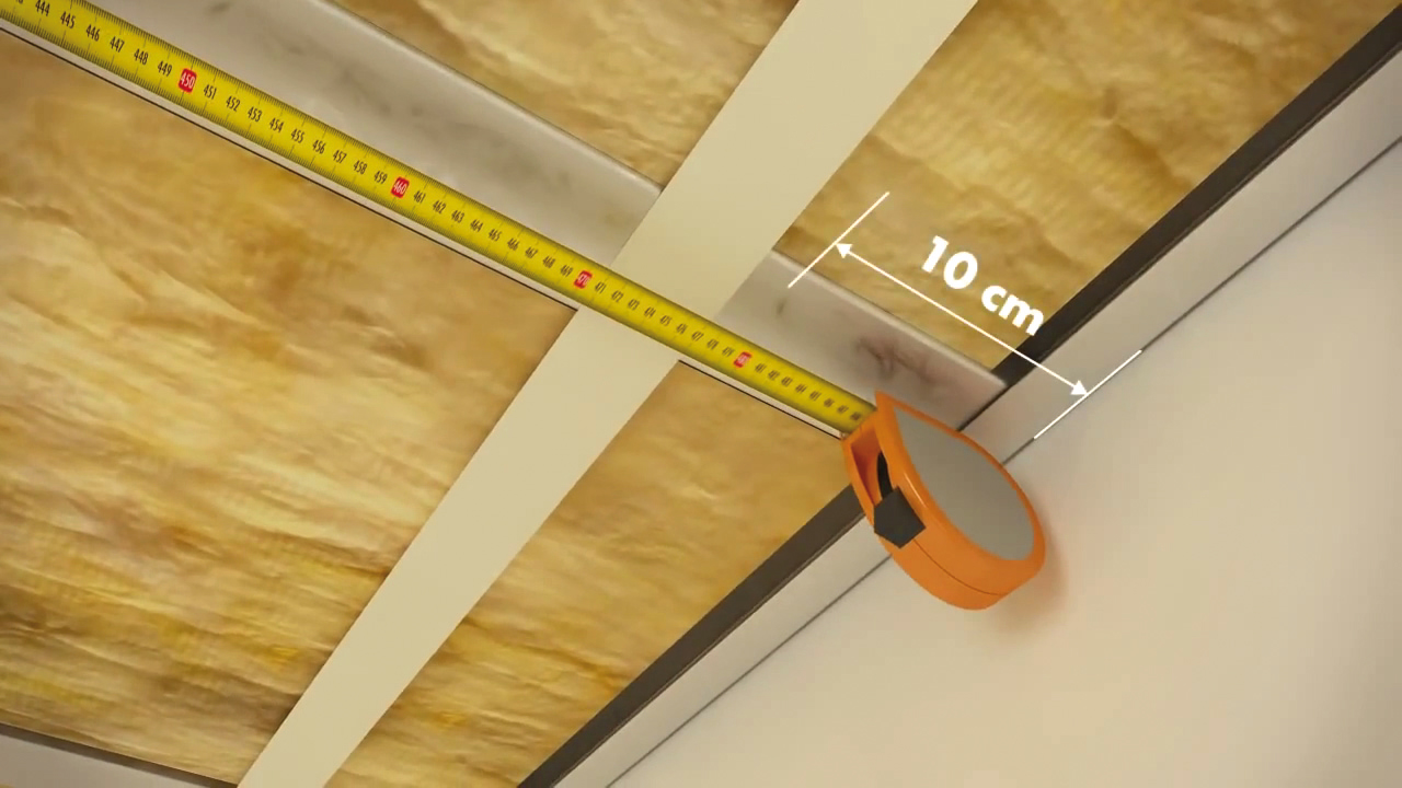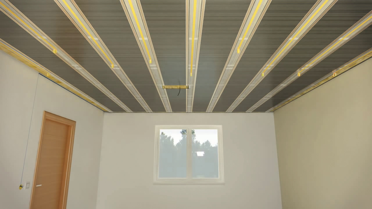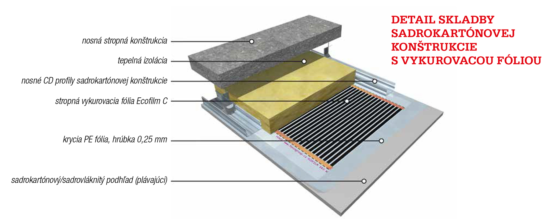 Na nosné CD profily sadrokartónovej podkonštrukcie sa nalepí obojstranne lepiaca páska. Vykurovacia fólia sa inštaluje súbežne s nosníkmi sadrokartónovej podkonštrukcie.