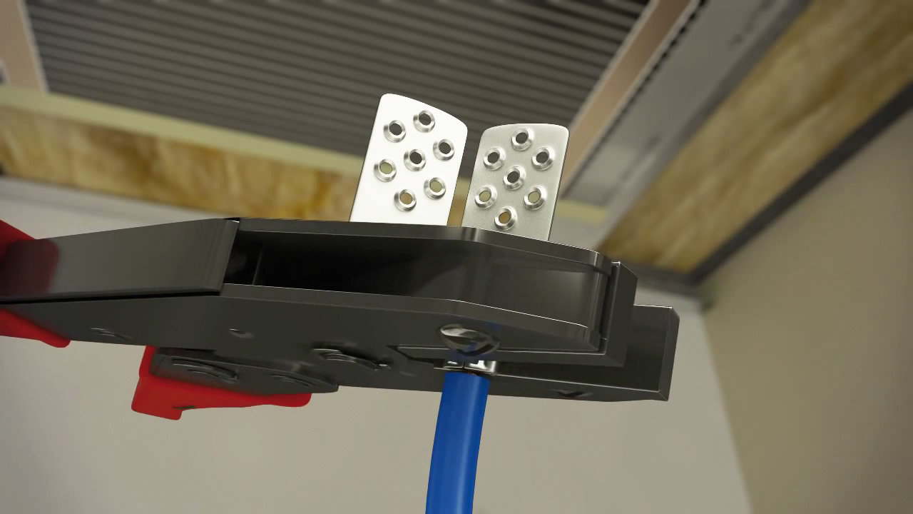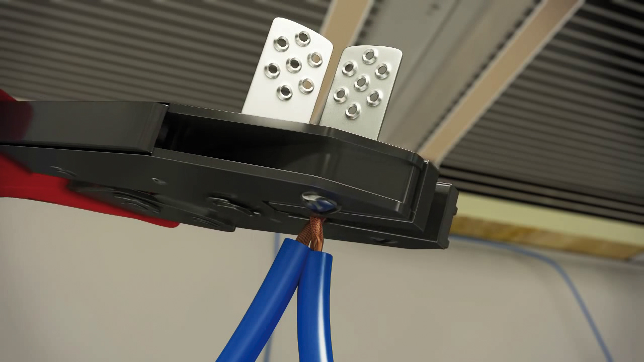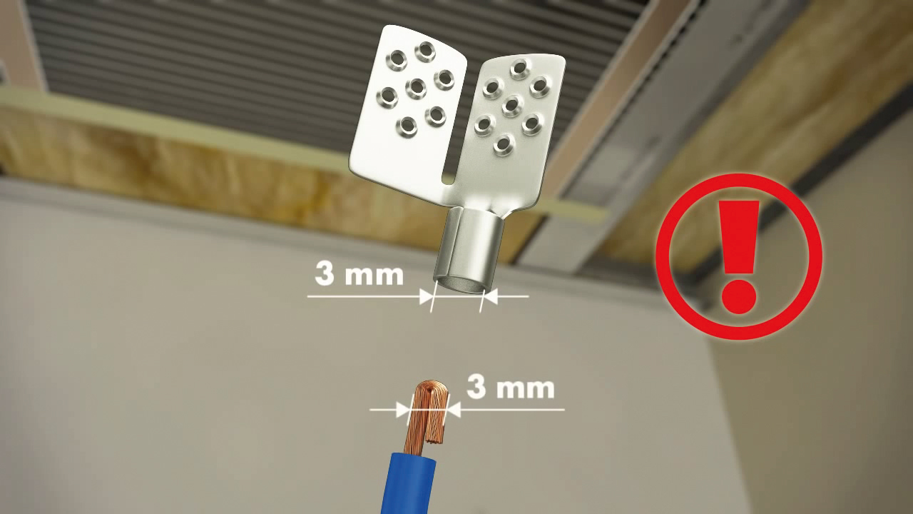 Pripájací konektor s nalisovaným vodičom sa umiestni v strede medenej zbernice pásu vykurovacej fólie a otvorená časť konektora sa uzavrie tlakom prstov. Lisovacími kliešťami sa pevne uzavrie opäť v dvoch krokoch. Západkový mechanizmus klieští bráni otvoreniu čeľustí pred dosiahnutím požadovaného tlaku.