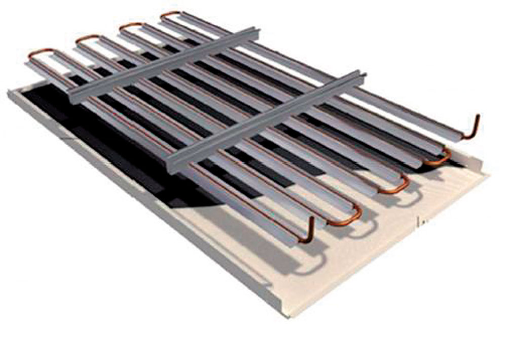 V budove tvorí odovzdávací systém stropné vykurovanie, ktoré je dimenzované na teplotný spád 40/37 °C v zimnej prevádzke. Stropné panely tohto hybridného systému odovzdávania tepla alebo chladu sú umiestnené pri transparentných konštrukciách. Stropný systém len na chladenie tvoria stropné pásy v stredných častiach miestností. V stropných paneloch je zalisovaná meandrovitá medená rúrka s priemerom 8 a 12 mm. Stropný sálavý panel je zobrazený na obr. 2.