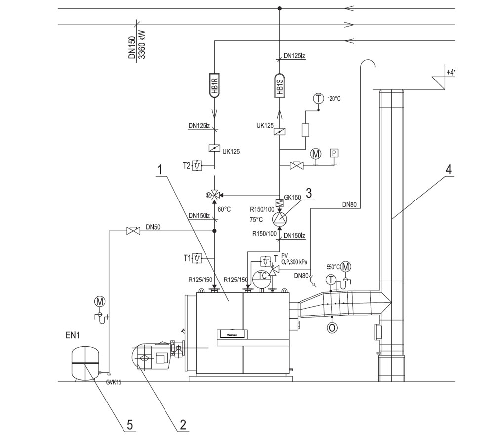 1 – plynový kotol Viessmann Vitoplex (100 – 1120), 2 – pretlakové horáky Weishaupt G7/1, 3 – kotlové obehové čerpadlo, 4 – komínové teleso DN500, 5 – expanzná nádoba