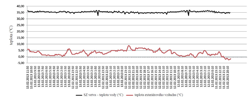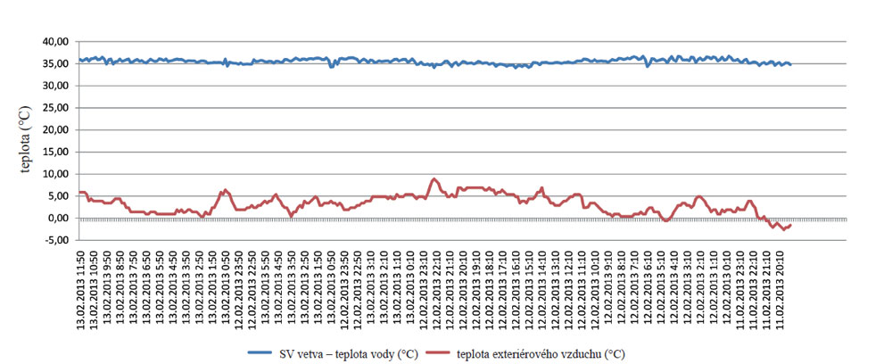 Obr. 8 Priebehy nameraných teplôt na severovýchodnej (SV) vetve vykurovania (exteriérová teplota a teplota vykurovacej vody privádzanej k stropným panelom v SV vykurovacej vetve)