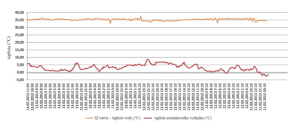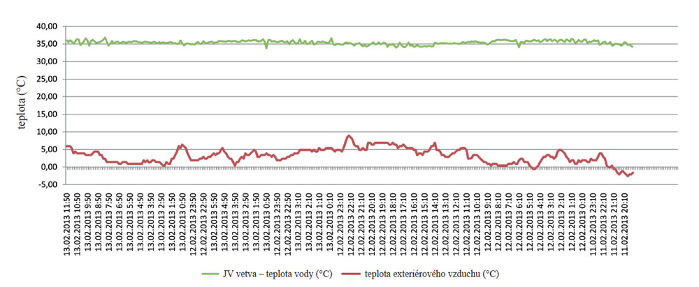 Keďže je budova z hľadiska svetových strán rozdelená na štyri vykurovacie vetvy po celej výške, zaznamenali sa teploty na prívodnom potrubí z každej vetvy stropného vykurovania a vzájomne sa na základe vonkajšej teploty porovnali. Namerané hodnoty sú znázornené v grafoch (obr. 8 až 11).