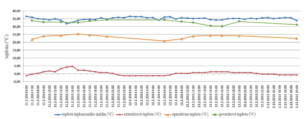 Na obr. 12 sú uvedené teploty teplonosného média, exteriérovej teploty, operatívnej a povrchovej teploty sálavých panelov v juhozápadnej vykurovacej vetve a v kancelárii na 3. NP.