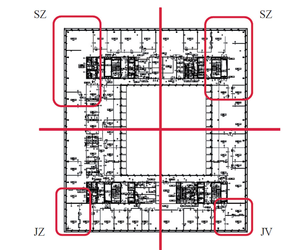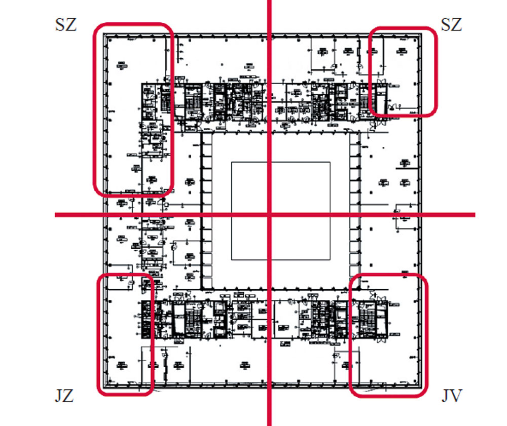 Na základe tepelného stavu zisteného v priestoroch sa určilo rozmiestnenie meracích miest na 3. NP a 8. NP vo všetkých štyroch rohoch budovy vo vzťahu k možným kombináciám polohy a činností zamestnancov, ktorí sa v miestnostiach pohybujú. Na obr. 4 je pohľad na budovu ústredia SLSP z Tomášikovej ulice s vyznačenými meracími miestami. Ďalšie dve meracie miesta sa nachádzajú na rovnakých podlažiach na rohoch budovy JZ/SZ. Na obr. 5 je znázornený pôdorys 3. NP spolu s kanceláriami, v ktorých sa realizovali merania tepelného stavu spolu s meraniami sálavého toku stropných panelov a termovíznym posúdením sálavých panelov. Na obr. 6 je znázornený pôdorys 8. NP spolu s kanceláriami, v ktorých sa realizovali merania tepelného stavu spolu s meraniami sálavého toku stropných panelov a termovíznym posúdením sálavých panelov.