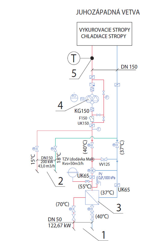 Na obr. 7 je znázornená schéma juhozápadnej vetvy vykurovania a chladenia v strojovni suterénu. Vo veľkoplošných kanceláriách na 3. NP (+3.1.71, +3.1.46, +3.1.64, +3.1.54), veľkoplošných kanceláriách na 8. NP (+8.1.01, +8.1.61) a menších manažérskych kanceláriách na 8. NP (+8.1.36, +8.1.47) administratívnej budovy sa podľa objektívnych faktorov zaznamenala vnútorná tepla prostredníctvom merania a regulácie v 10-minútovom intervale od 17. 9. 2012. Rovnako sa od 17. 9. 2012 v hodinových intervaloch zaznamenáva exteriérová teplota a v 10-minútových intervaloch teplota prívodnej vykurovacej vody, a to v prípade všetkých štyroch čerpadlových skupín v závislosti od orientácie na svetové strany.