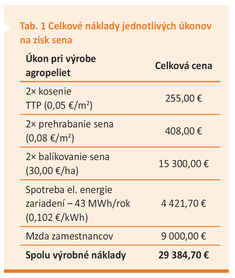 Náklady na výrobu paliva predstavujú náklady vzniknuté pri výrobe agropeliet a drevnej štiepky. Pri stanovení ceny agropeliet bolo potrebné rozdeliť výrobnú prevádzku do dvoch sekcií. Prvá sekcia pozostáva z nákladov vynaložených pri zisku sena, teda pri kosení, prehrabaní a samotnom balíkovaní vysušeného sena. Celkové náklady jednotlivých úkonov na zisk sena sú uvedené v tab. 1 – počítalo sa s rozlohou trávnatých porastov 255 ha. V druhej sekcii sa počíta s nákladmi na spotrebu elektrickej energie navrhnutého drviča balíkov sena a peletovacej linky. V tomto prípade sa zohľadnila aj nutná pracovná obsluha zariadení. Pri výrobe paliva sa počítalo s vytvorením nových pracovných miest a s pracovným časom 8 hodín (počas pracovného dňa). Celkové ročné náklady sú uvedené v tab. 1.
