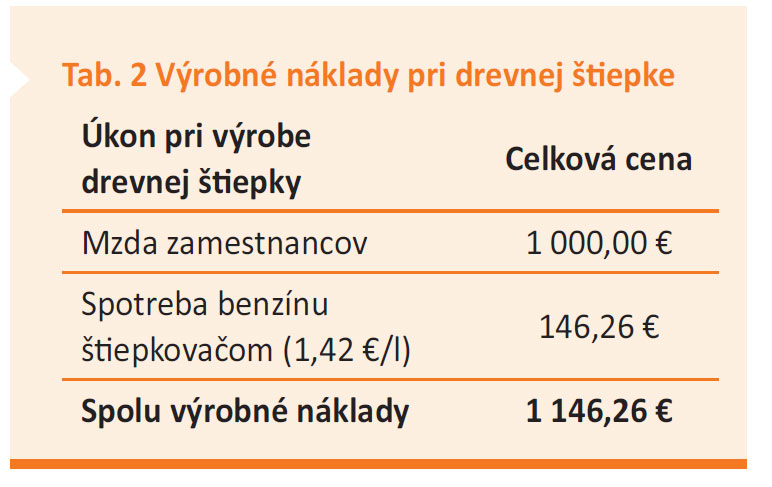 Ak vypočítame náklady na výrobu 1 t agropeliet, vyjde cena 85,36 €/t. Pri porovnaní tejto výrobnej ceny s predajnou cenou agropeliet, ktorá sa pohybuje na trhu na úrovni okolo 175,00 €/t, je naša výrobná cena skoro 2-krát lacnejšia. Z potrieb paliva vychádza potom aj nadprodukcia agropeliet, a to s hmotnosťou 26,3 t. Ak by sa táto nadprodukcia uviedla na trh, priniesla by z predaja ročné prilepšenie o 4 598,00 €. Ako sme už spomínali, drevná štiepka vyprodukovaná z údržby zelene zníži potrebu dokupovania drevnej štiepky v mesiaci február, čím sa znížia aj náklady. Ani pri drevnej štiepke však nesmieme zabúdať na výrobné náklady, ktoré sú uvedené v tab. 2.
