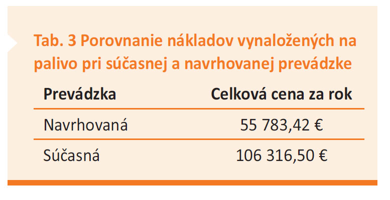 Z porovnania nákladov vynaložených na palivo pri súčasnej a navrhovanej prevádzke (tab. 3) je zrejmé, že pri prevádzke navrhovanej kotolne sa ročne ušetrí skoro polovica nákladov. Pri ročnej spotrebe energie 6 859,3 GJ dokážeme v súčasnosti vyrobiť 1 GJ tepla zo spaľovania zemného plynu za 15,50 €, kým pri nami navrhovanej prevádzke spaľovania palív sa 1 GJ tepla vyrobí za 8,13 €.