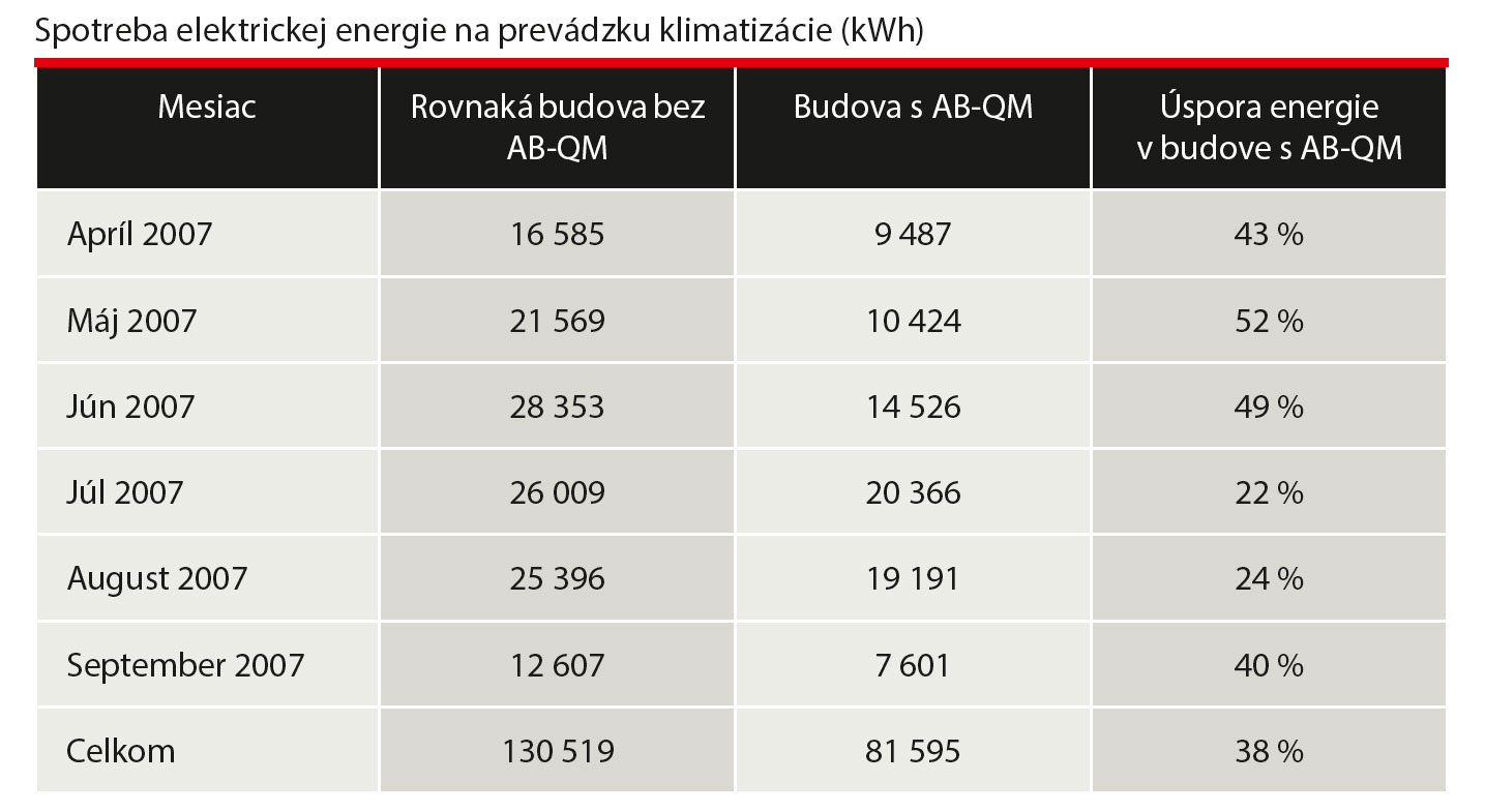 Spotreba elektrickej energie: Podľa merania spotreby elektrickej energie v letnom období v roku 2007, keď boli chladiace systémy v oboch porovnávaných budovách v plnej prevádzke, bola spotreba energie v budove s technológiou AB-QM v priemere o 38 % nižšia ako v budove s bežnými ventilmi. Najvyšší rozdiel v spotrebe energie bol zaznamenaný v mesiaci máj, keď úspora energie vďaka lepšej regulácii v budove s technológiou AB-QM dosiahla 52 %. |