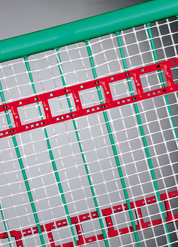 Obr. 3 Detail kapilárnej rohože: kapilárne rúrky napojené na rozvodné potrubie sú pokryté sklotextilnou sieťkou. Na rohoži je pripevnený rebrík na zabezpečenie pravidelných rozstupov