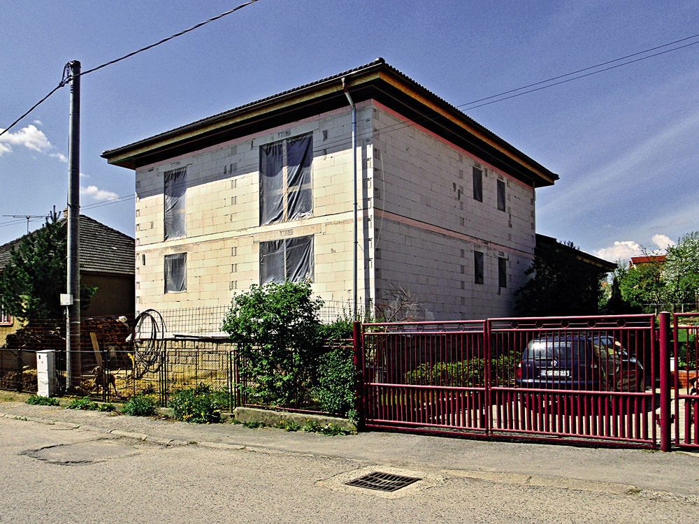 Dvojpodlažný rodinný dom v Galante predstavuje novostavbu s moderným terasovitým dizajnom. Obvodové murivo sa realizovalo pomocou strateného debnenia z tvárnic VELOX. Vykurovaná/chladená podlahová plocha objektu má rozlohu 309 m2. Zdrojom tepla je tepelné čerpadlo zem – voda, objekt má zároveň predprípravu na solárny systém. Chladenie je pasívne, pomocou zemného kolektora, v prípade potreby je pripravené tepelné čerpadlo zem – voda. Podobne ako pri rodinnom dome v Breze, aj tu sa využíva regenerácia zeminy. V zime sa zo zeminy teplo odoberá, takže zemina je už v lete dostatočne vychladená, zatiaľ čo v lete sa prebytočné teplo do zeminy akumuluje a tá sa regeneruje. Kapiláry sa inštalovali len v strope, čo umožnilo lepšie využitie plochy ako pri podlahovom systéme (na strope neprekáža žiadny nábytok) a zároveň výber ľubovoľnej podlahovej krytiny – hrubého koberca do spálne, drevenej podlahy do obývačky atď. V kúpeľniach sa stropný systém doplnil podlahovým systémom, aby sa v zime dosiahol požadovaný vysoký tepelný výkon. V prípade tohto rodinného domu investor kládol dôraz na možnosť vykurovať aj chladiť tým istým systémom počas celého roka pri veľmi nízkych prevádzkových nákladoch. Ďalším dôvodom bola snaha vyhnúť sa štandardnému spôsobu chladenia vzduchotechnikou a súvisiacim problémom, ako je vírenie prachu či prievan. Pohľad na rodinný dom je na obr. 11. Pohľad na kapilárne rohože uložené v strope je na obr. 12.