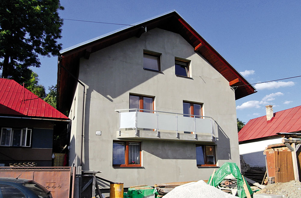 Novostavba trojpodlažného rodinného domu postaveného na pôvodnej základovej doske má obvodové murivo z tvárnic Ytong Lambda. Vykurovaná/chladená podlahová plocha má rozlohu 287 m². Ako zdroj tepla slúžia tepelné čerpadlo zem – voda a solárny systém. Chladenie je pasívne, pričom chlad sa získava zo zemného kolektora. V prípade potreby možno na chladenie využiť tepelné čerpadlo zem – voda. Výhodou takéhoto systému je, že v zime sa zo zeminy odoberá teplo, čím sa zemina ochladzuje a tak sa pripravuje na letnú prevádzku. Naopak, v lete sa prebytočné teplo do zeminy ukladá a zemina sa regeneruje, vďaka čomu obsahuje dostatok tepla na zimnú prevádzku. Hoci stropy a podlahy sú v tomto prípade zapojené osobitne (z dôvodu možnosti vykurovať podlahou a chladiť stropom), pri prevádzke sa z hľadiska komfortu a ekonomiky ukázalo ako najvýhodnejšie ponechať všetky okruhy otvorené. Tak sa dosiahli minimálne zmeny teploty vykurovacieho/chladiaceho média počas roka. Motiváciou investora na inštalovanie kapilárnych rohoží boli maximálne úspory energie a komfort, zásadnou bola požiadavka na nenáročnú údržbu systému a jednoduchú reguláciu s minimálnymi nárokmi na obsluhu. Pohľad na rodinný dom je na obr. 7. Pohľad na kapilárne rohože inštalované v podlahe a v strope je na obr. 8.