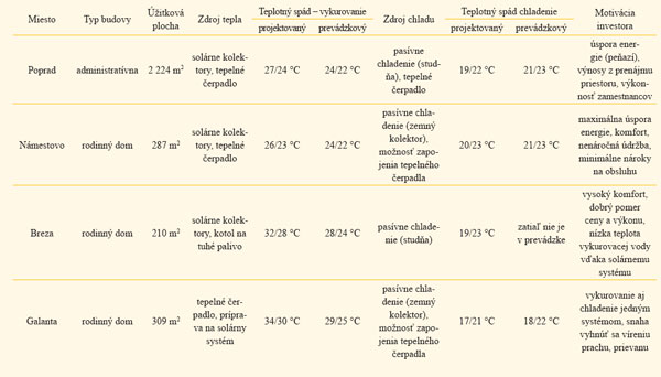 Základné charakteristiky prezentovaných budov s inštalovaným systémom kapilárnych rohoží sú uvedené v tab. 1. V opise sú uvedené projektované teplotné spády na vykurovanie aj chladenie i prevádzkové teplotné spády. Prevádzkový teplotný spád predstavuje skutočný teplotný spád, pri ktorom systém v súčasnosti funguje. Pri všetkých uvádzaných objektoch platí, že prevádzkový teplotný spád je priaznivejší ako projektovaný teplotný spád, a to aj pri extrémnych klimatických podmienkach v zime.