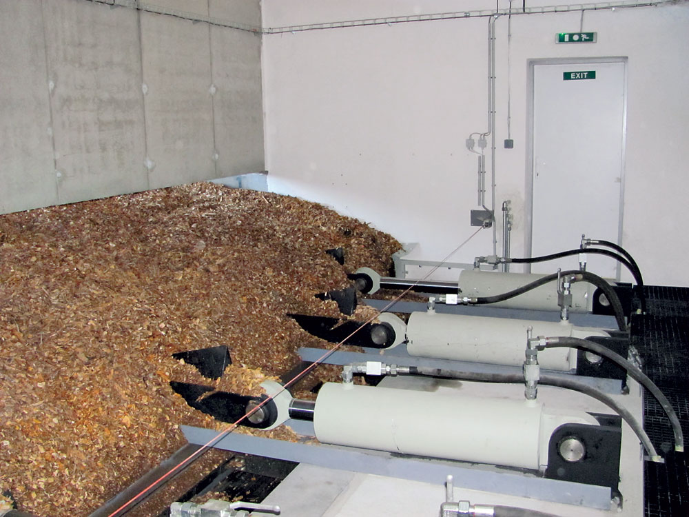 V sklade paliva je umiestnených päť kusov posuvných hydraulických podláh. Objem zásobníka je 470 m3, čo zodpovedá spotrebovaniu paliva pri plnom výkone kotlov za 2 až 3 dni. Súčasťou areálu kotolne je aj vonkajší sklad paliva, ktorý pokrýva spotrebu až na päť dní prevádzky v zimnom období.