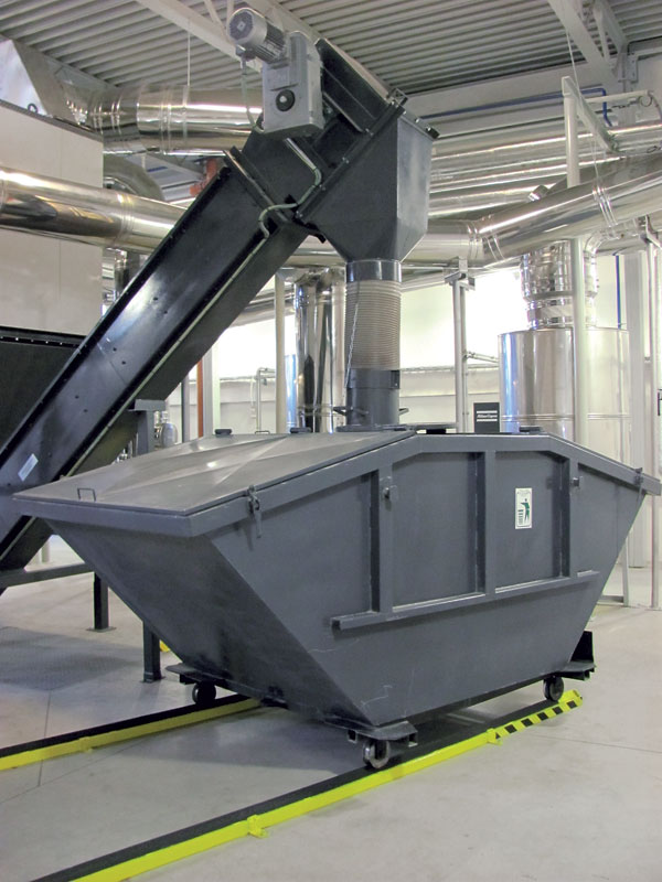 Po vyhorení paliva sa popol zo spaľovacej komory vyhrabáva dopravníkmi. Dva sa nachádzajú priamo pod roštom, tretí, vodou chladený, na konci roštu. Následne sa popol transportuje samostatným reťazovým dopravníkom do veľkokapacitného kontajnera s objemom 5 m3, ktorý je umiestnený na úrovni kotolne. Do tejto dopravnej cesty je zavedený aj popolček zachytený zo spalín v multicyklónoch pred ich vyvedením do komína. Výhodou tohto riešenia je plne automatický systém, ktorý vyžaduje minimálne nároky na stavebnú pripravenosť a jednoduchú prevádzku. Pri tomto riešení nie sú kontajnery na popol umiestnené priamo pod kotlami, čo by prinieslo zvýšené náklady na prehlbovanie podlahy kotolne a zložitú manipuláciu s naplneným kontajnerom popola.