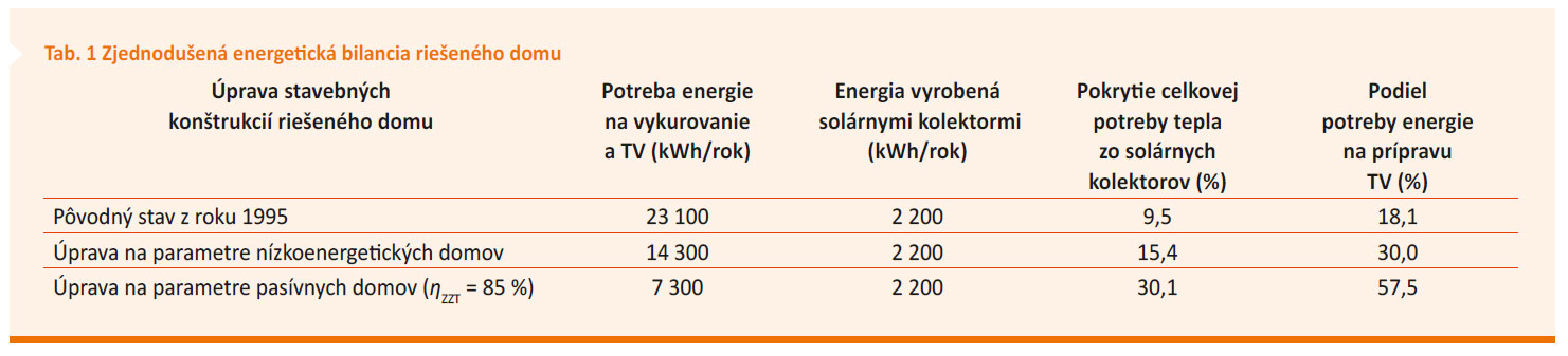 Čo však v prípade, keď sa majiteľ domu rozhodne zatepliť dom a znížiť tak nároky na potrebu tepla na vykurovanie? Aký vplyv budú mať tieto opatrenia na využitie solárnych kolektorov v celkovej bilancii domu? V prvom prípade budeme počítať so zateplením na úroveň požadovanú pri nízkoenergetických budovách. Celková potreba energie na vykurovanie sa zníži na približne 10 100 kWh/rok. V druhom prípade budeme uvažovať o zateplení na úroveň požadovanú pri pasívnych budovách a budeme rátať s využitím spätného získavania tepla na vetranie domu (ηZZT = 85 %). Celková potreba energie na vykurovanie je potom približne 3 100 kWh/rok. Výsledky pri jednotlivých vypočítaných variantoch zhŕňa tab. 1.