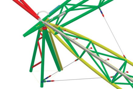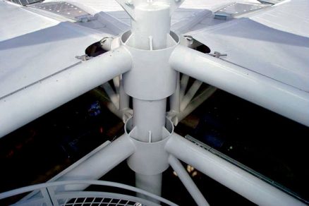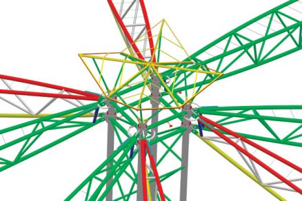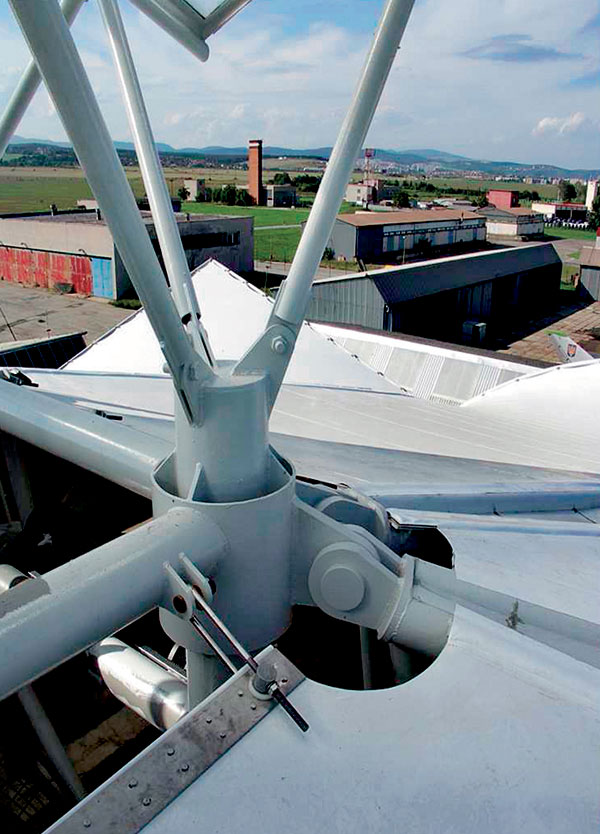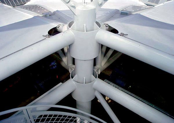 Riešenie spočíva v centrálnom podpornom stĺpovom systéme a v obvodových podporách. Medzi podporami po obvode sú trojuholníkové priestorové priehradové nosníky s premenlivou geometriou. Premenlivá geometria trojuholníkových priehradových nosníkov je takisto medzi obvodovými podporami a centrálnym stĺpovým systémom.