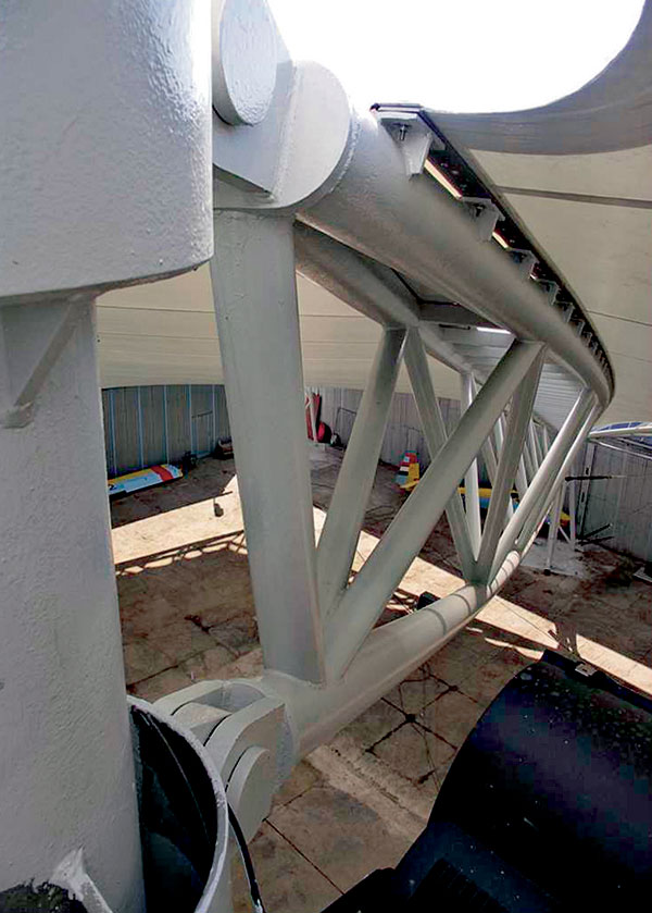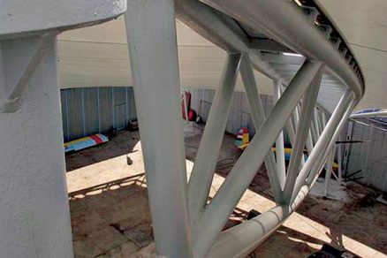 Vyhliadková galéria nad lietadlami tvorí spolu s centrálnym oceľovým schodiskom, oceľovými ochodzami a štyrmi rúrovými stĺpmi centrálny podporný systém. Obvodové stĺpy sú riešené ako priestorové ihlany do výšky 4,4 m, na vrcholoch ktorých sedia základné oporné body priestorových priehradových nosníkov. Priestor prekrýva plachtovina, ktorá je z dôvodu eliminácie hrdzavenia uchytená materiálmi z antikora.