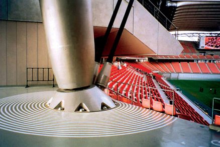 Stabilita strešnej konštrukcie proti saniu vetra je zabezpečená pomocou štyroch čelných závesov, ktoré sú pripojené k pozdĺžnym hlavným priehradovým nosníkom a kotvené do pätiek pylónov. Pylóny majú premenný prierez s najväčším priemerom 3,5 m.