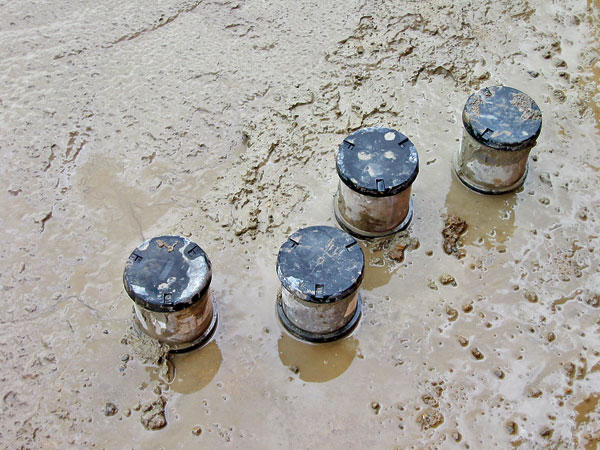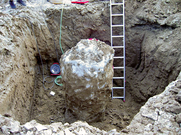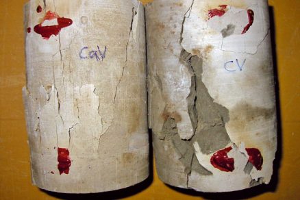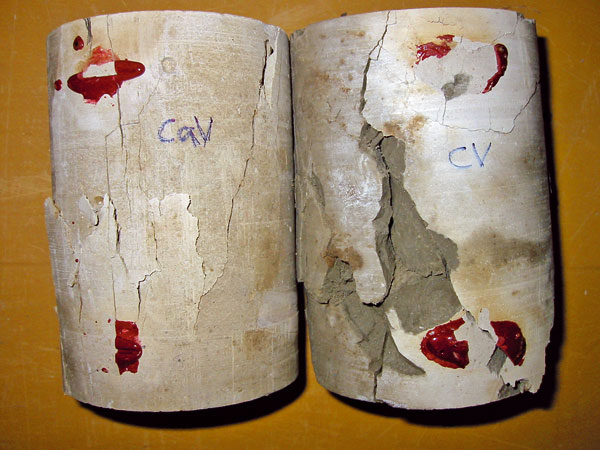 Piliere PI sa zhotovili modifikovanou metódou M1 tak, aby sa aj v ílovitých zeminách dosiahol priemer 0,9 m. Na zistenie materiálových vlastností pilierov PI sa už úplne bežne využíva odber vzoriek premiešanej prebytočnej zmesi z výronu z ústia vrtu (obr. 3). Po ich vyzretí v mokrom prostredí sa vykonali laboratórne skúšky na stanovenie pevnosti a deformačných modulov. Zhotoviteľ pilierov PI na preukázanie skutočne dosiahnutého priemeru a účinnosti zvolenej technológie v ílovitých zeminách vsadil navyše dva krátke pokusné piliere PI do hĺbky 4 m a následne ich vykopal (obr. 4). Z týchto pilierov sa jadrovými vrtmi odobrali vzorky na stanovenie materiálových vlastností laboratórnymi skúškami (obr. 6).