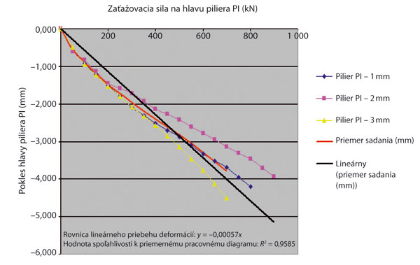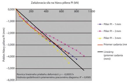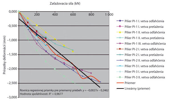 Aj keď piliere boli v ílovitom prostredí, ich materiálové vlastnosti, nosnosť a deformačné vlastnosti veľmi príjemne prekvapili. Na základe výsledkov záťažových skúšok bolo možné konštatovať, že pri dosiahnutí zaťaženia 750 až 900 kN nedošlo ani k náznaku straty nosnosti piliera. Aj deformačné vlastnosti pilierov boli veľmi priaznivé, nezanedbateľnú úlohu v tomto prípade hralo i čiastočné vystuženie dĺžky driekov pilierov vloženými armokošmi zo štyroch betonárskych prútov. Priebeh deformácií všetkých troch pilierov bolo možné zjednotiť do dvoch spriemerovaných grafov s lineárnymi priebehmi – grafu priebehu deformácií pri zaťažovaní (obr. 7) a grafu priebehu vetiev deformácií pri opakovanom odľahčovaní a zaťažovaní (obr. 8).