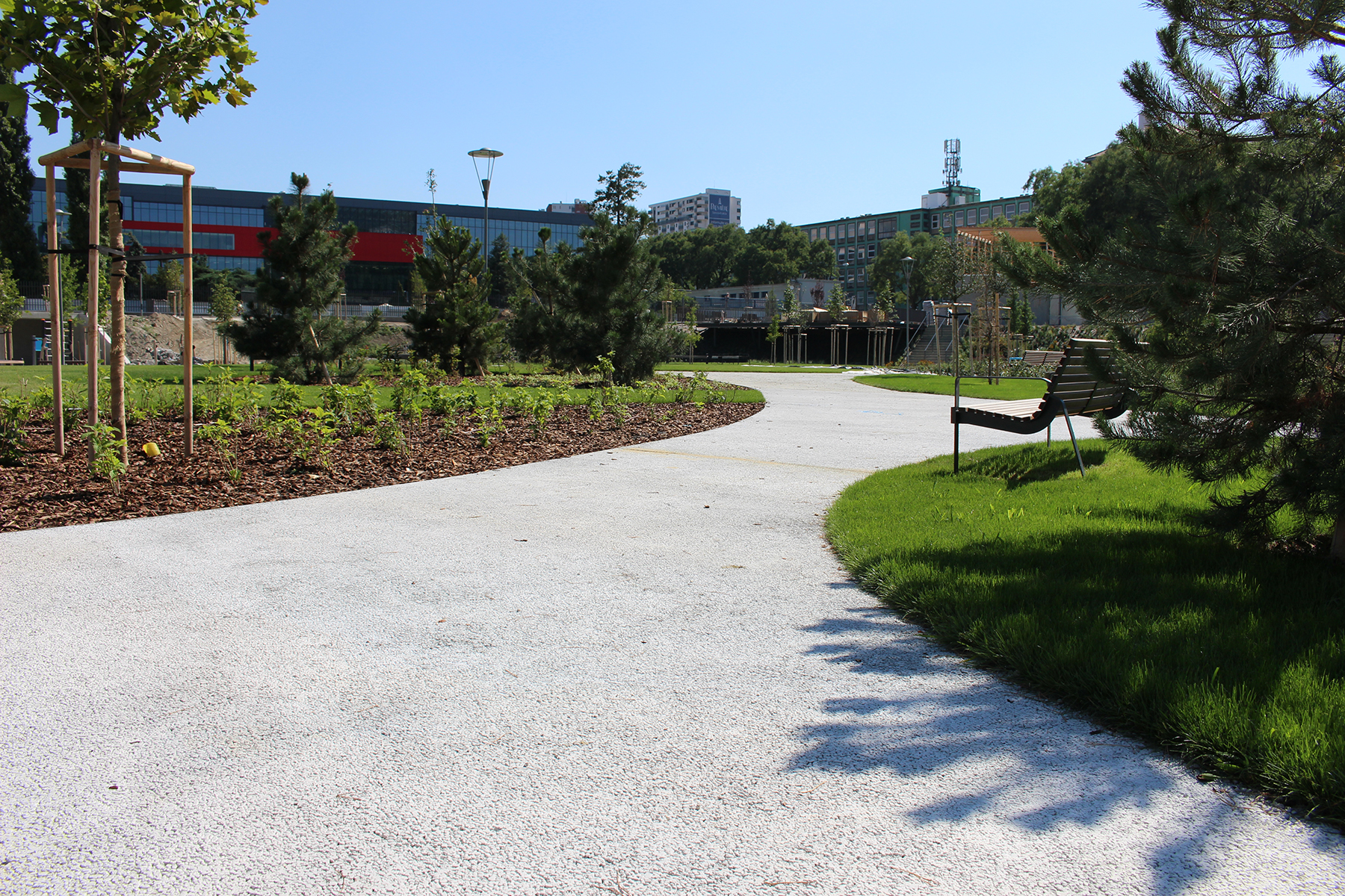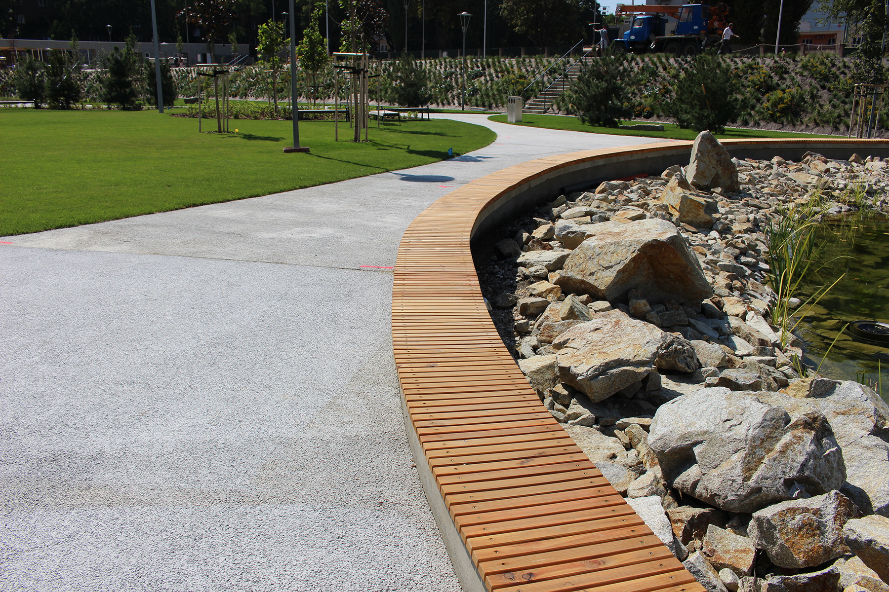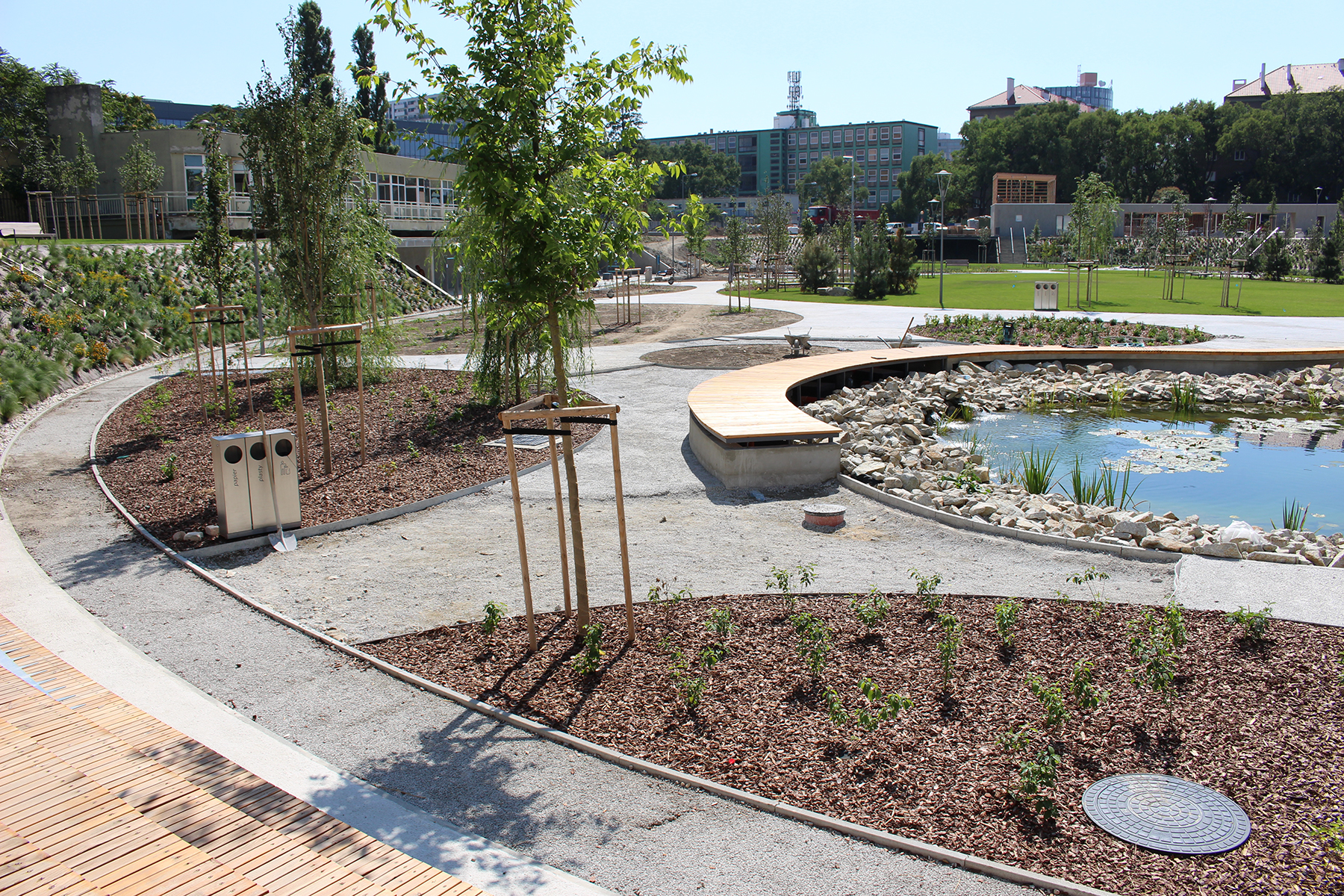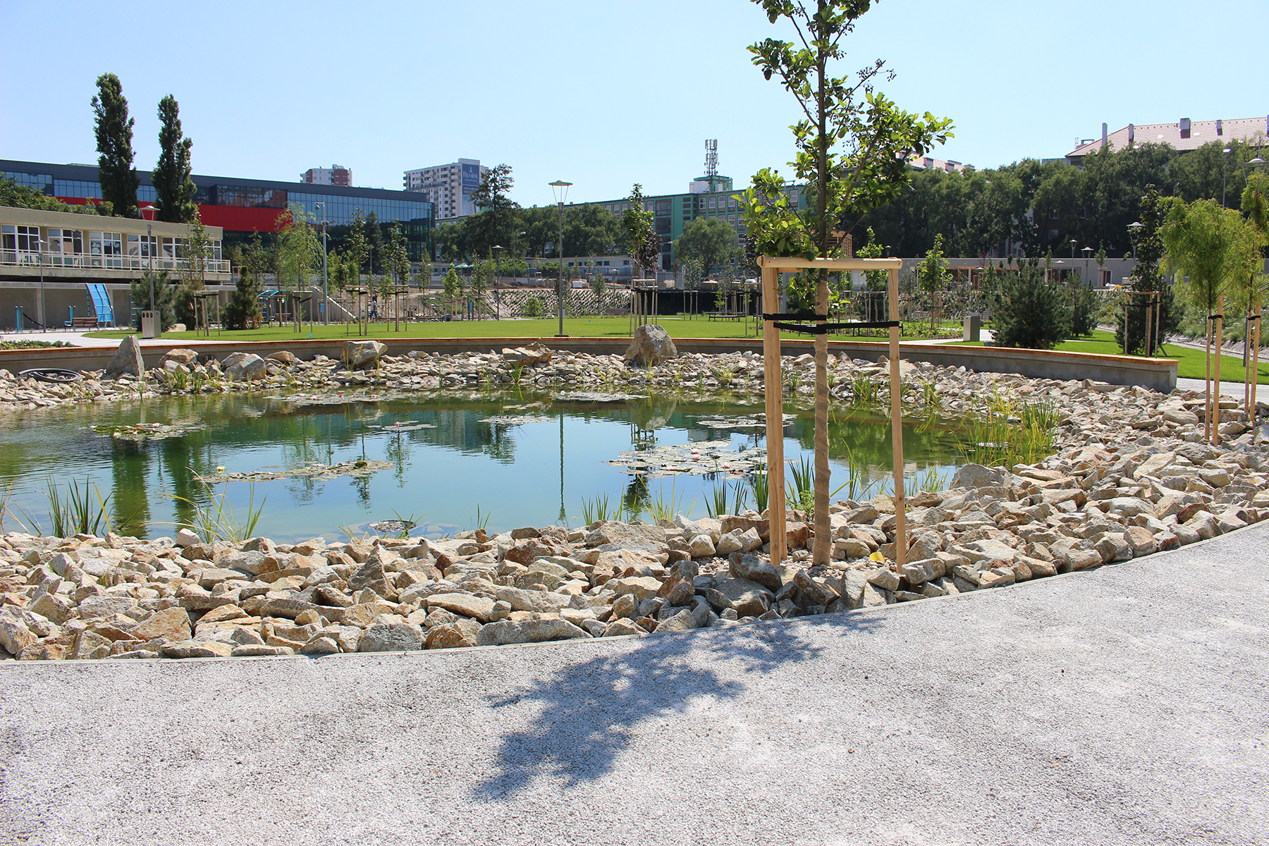 ZAPA beton dodal na chodníky špeciálny drenážny betón ZAPA DROP, ktorý prepúšťa dažďovú vodu. Tá sa pomocou drenážneho potrubia odvádza do jazierka a používa sa na zavlažovanie celého areálu.