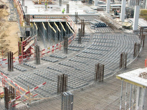 Na výstavbu varšavského štadióna sa využívali prefabrikované filigránové dosky, do ktorých sú zabudované moduly Cobiax.