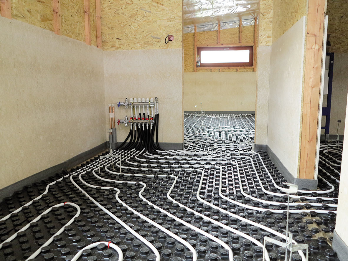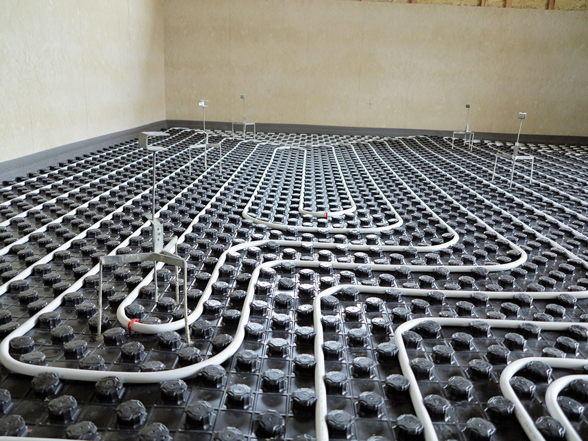 Na podkladovej konštrukcii s rozvodmi podlahového vykurovania sa vyplnia medzery medzi káblami a rúrkami polystyrénom EPS 100, prípadne cementovou liatou penou. Na rozvody sa uloží tepelná izolácia. Tepelná, prípadne kroková izolácia sa prekryje separačnou vrstvou. Po obvode sa na murivo upevní dilatačná páska z penového polystyrénu s hrúbku 10 až 15 mm. Pri podlahovom vykurovaní sa na tepelnú izoláciu uložia systémové dosky, prípadne odrazová fólia a pod. Systémová doska je najčastejšie v tzv. nopovom (kupolkovom) vyhotovení. Výbežky uľahčujú montáž rúrok podlahového vykurovania, pomáhajú dodržať presné rozstupy medzi rúrkami (100 až 150 mm). Výška trojnožiek, do úrovne ktorých sa bude poter liať, sa nastaví hadicovou vodováhou alebo laserom. Tým sa zabezpečí rovina, rovnomerná výšková úroveň na celej ploche podlahy.