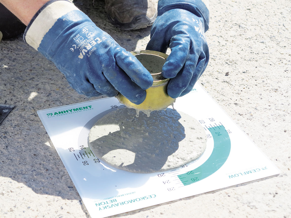 Pred liatím čerstvej zmesi na pripravený podklad sa skontroluje konzistencia dovezenej zmesi skúškou rozliatia. Konzistencia cementového poteru sa zmeria na navlhčenej rozlivovej doske pomocou maltového kužeľa (podľa STN EN 1015-: 2000) (anhydridové potery sa testujú na suchej doske).