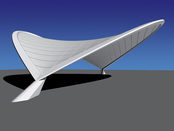 Membrána dvojitej krivosti sa študovala na konštrukciách, ktoré vychádzajú z riešenia rekonštruovanej kongresovej haly postavenej v Berlíne. Zatiaľ čo hala v Berlíne je monolitická (obr. 10), nami študovaná konštrukcia je zostavená z prefabrikovaných prvkov. Strechu tvorí zdeformovaná plocha podporovaná sklonenými oblúkmi (obr. 11). Protiľahlé rovinné oblúky sú rámovo spojené so šikmými stojkami, ktoré sú votknuté do pätiek vzájomne spojených predpätým ťahadlom (obr. 9).