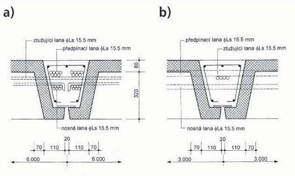 Prefabrikované prvky skladbových rozmerov 6 × 3 m sa vyľahčili kazetami, ktoré tvoria dosky stužené okrajovými nosníkmi a priečnym rebrom, navrhnuté z ľahkého konštrukčného betónu LC30/33 a pri montáži zavesené na predpínacie laná situované v priečnych škárach medzi týmito prvkami (obr. 7). V týchto škárach sú tiež umiestnené predpínacie laná. Zatiaľ čo nosné laná ∅ Ls 15.5 môže chrániť proti korózii iba predpätý betón škár, predpínacie laná sú navrhnuté ako monostrandy. To umožní ich napnutie po vybetónovaní škár medzi prvkami. V pozdĺžnom smere je konštrukcia stužená pozdĺžnymi škárami, ktoré je vhodné slabo predopnúť monostrandami.