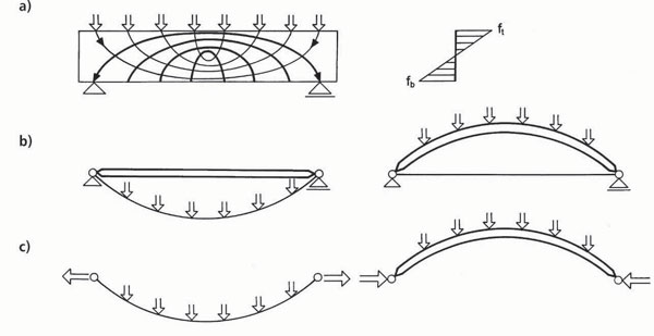 Rovnomerne zaťažený betónový oblúk môže preklenúť niekoľko kilometrov, visuté lano niekoľko desiatok kilometrov. Ich tvar však musí byť vždy výslednicový k danému zaťaženiu a kábel alebo oblúk musia mať dostatočný previs alebo vzopätie.