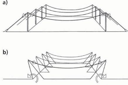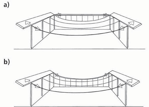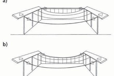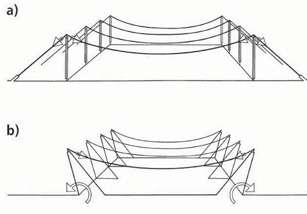 Nosné káble sú zvyčajne kotvené v hlaviciach stĺpov. Vodorovná sila sa z kotevných blokov prenáša do základov buď vonkajšími sklonenými káblami ako pri visutých mostoch (obr. 3a), alebo ohybovou tuhosťou stĺpov (obr. 3b). Možno tiež navrhnúť tzv. samokotviaci systém. V tomto prípade sú hlavice stĺpov vzájomne spojené ohybovo tuhým nosníkom, ktorý prenáša vodorovnú silu do tlačených prvkov spájajúcich protiľahlé strany. Tlačený prvok môže tvoriť vzpera a/alebo oblúk. Vzpera je zvyčajne spojená s ťahaným predpätým pásom, ktorý zabezpečuje jej stabilitu (obr. 4a). Oblúk je väčšinou situovaný na vonkajších okrajoch strechy a je spojený stĺpmi so základmi (obr. 4b). Tieto stĺpy bránia vybočeniu oblúkov, preto môže byť oblúk veľmi štíhly. Je samozrejmé, že v konštrukciách možno tieto základné systémy vzájomne kombinovať.