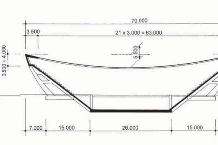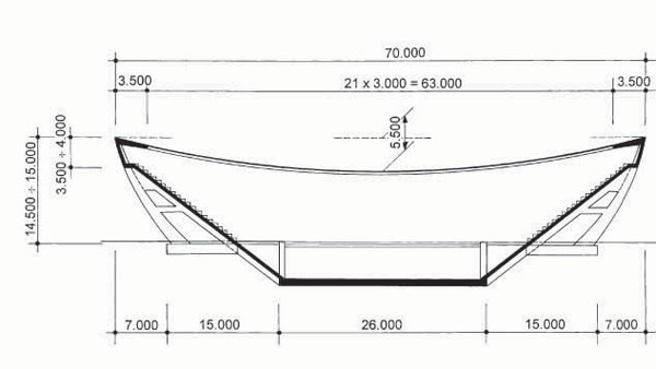 Konštrukciu strechy s rozpätím 70 m tvorí membrána zostavená z prefabrikovaných prvkov hrubých 400 mm (obr. 5 a 6). Prefabrikované prvky sú nesené predpínacími lanami, ktoré sú kotvené v priečnych rámoch situovaných po 6 m. Priečne rámy podopierajúce hľadisko sú pod bazénom spojené rebrami podporujúcimi dno bazéna a prenášajúcimi časť vodorovnej sily z káblov. Hlavice rámov sú spojené plochými pozdĺžnymi nosníkmi z betónu C50/60, ktoré nielen stužujú konštrukcie v pozdĺžnom smere, ale tiež prenášajú časť vodorovnej sily z káblov do krajných oblúkov. Konštrukcia strechy tak pôsobí ako kombinácia statických systémov znázornených na obr. 3b a 4b.